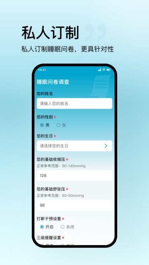 私人定制的睡眠问卷,获取针对性睡眠监测服务,提升个性化体验。